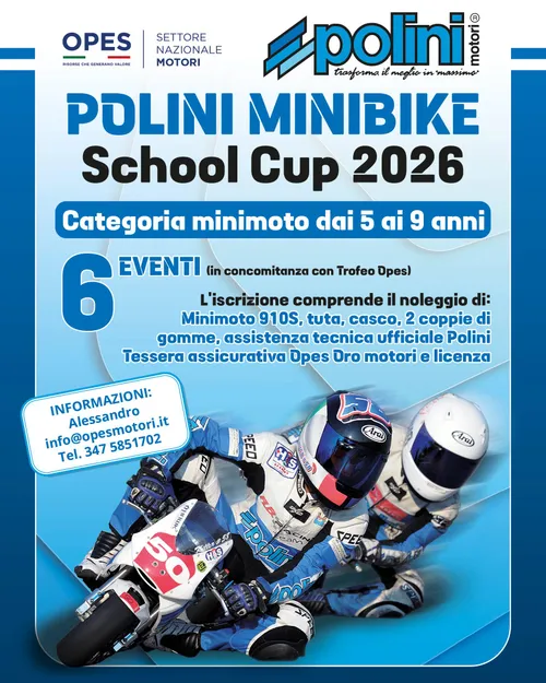 Organizzata da OPES motori minimoto, la Polini Minibike School Cup 2026 è la scuola minimoto ideale per avvicinare i bambini al mondo delle due ruote in modo educativo, sicuro e divertente.