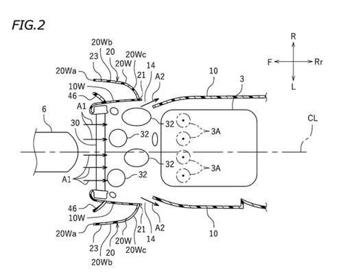 Inoltre, poiché l'elemento di guida è posizionato all'esterno della carenatura laterale, il volume dello scambiatore di calore non è limitato dalla sua installazione. Ciò consente di aumentarne il volume. Pertanto, la motocicletta descritta consente sia un aumento del volume dello scambiatore di calore sia una migliore efficienza di raffreddamento.