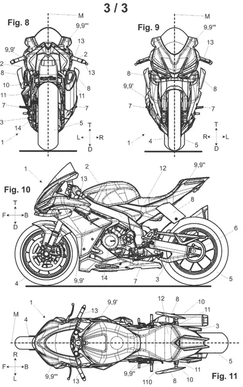 The patent clearly shows that Aprilia is seeking to bring certain MotoGP-derived aerodynamic solutions to the road, especially after popularizing “ground-effect wings” on the RS 660 Trofeo / RSV4 XTrenta.