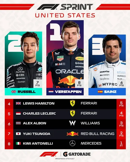 Questa Sprint Verstappen l'ha dovuta comunque sudare, visto che George Russell dopo la ripartenza ha provato l'attacco. Il britannico è andato lungo portandosi fuori pista l'olandese che quindi si è ripreso subito la posizione. Dopo quel momento Max ha preso un po di vantaggio ed è passato per primo sotto la bandiera a scacchi iniziando benissimo questo weekend di Formula 1. Russell chiude secondo mostrando come la Mercedes sia in forma e l'attacco iniziale fa ben sperare per il proseguo di questo appuntamento a stelle e strisce. Il podio di questa gara corta lo chiude Carlos Sainz con la Williams che riesce a tenere dietro le due Ferrari.
