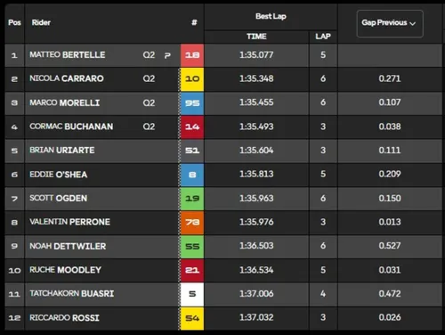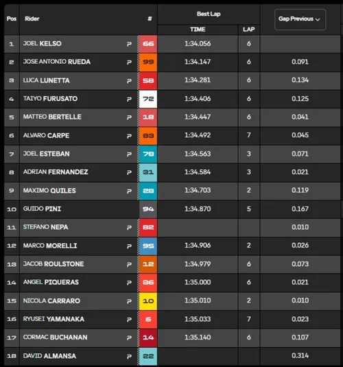 Tre italiani in azione in questa prima sessione, la maggiore sorpresa però è Valentin Perrone, rookie d'attacco nell'ultimo periodo e stavolta invece in grave difficoltà. Meno problematico invece il debutto a Phillip Island del connazionale Marco Morelli, che invece per la prima volta si prende la Q2! Davanti a lui i nostri Matteo Bertelle e Nicola Carraro, la vicinanza a casa fa bene anche al pilota kiwi (neozelandese) Cormac Buchanan, che si prende l'ultimo posto disponibile.