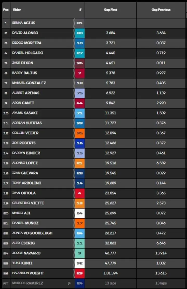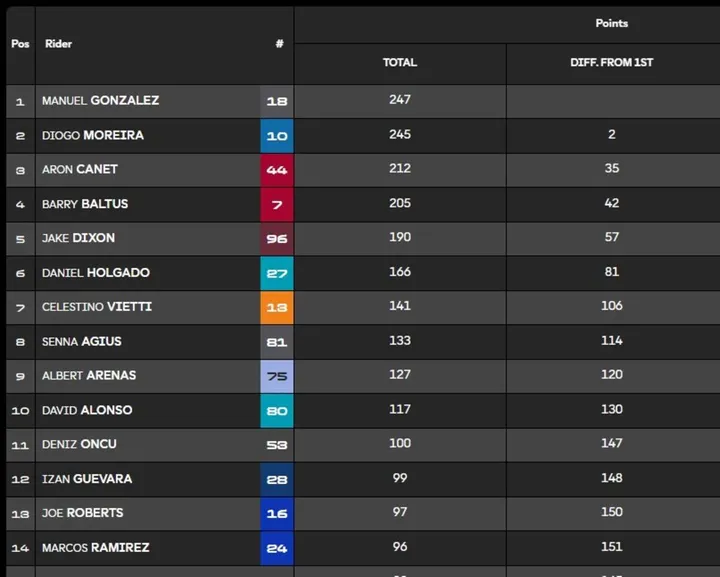 Mentre Agius scrive la sua storia senza sbavature, il brasiliano e lo spagnolo non si mollano davvero. Sorpassi, risposte, sempre a distanza ravvicinata, per stare uno davanti all'altro. Ma giro dopo giro recuperano Alonso (risalito), Dixon, Holgado (con grosso rischio annesso), Baltus e Arenas. È una lotta serrata, ma bisogna fare i conti anche col calo delle gomme nella seconda parte di gara. Sta di fatto che chi ne risente di più è proprio il leader Moto2, una bruttissima notizia che lo porta a scendere fino al 7° posto. Il peggio per lui è vedere Moreira in aperta lotta per il podio fino alla fine, chiudendo 3° al traguardo. La situazione mondiale è ancora più viva: Gonzalez 247 punti, Moreira 245, ed ancora tre GP in cui può succedere di tutto.