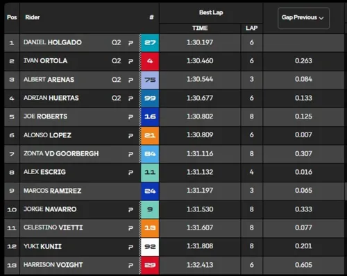 Manuel Gonzalez non appare perfettamente in simbiosi con la sua KALEX, ma si prende di forza la terza casella in griglia. Prima di lui c'è Senna Agius, determinato a ben figurare sul tracciato di casa e quindi mina vagante da tenere d'occhio. Da evidenziare la risalita all'ultimo di Aron Canet, infine 8°, che riesce in qualche modo a "scusarsi" per la corsa contro il tempo nel box Fantic per sistemare la sua moto dopo una brutta caduta. Si è fermato invece Filip Salac, che ancora risente di un precedente infortunio ad una spalla.