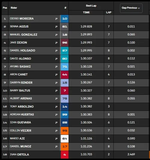 squalifica di Gonzalez a Mandalika, ma i danni alla sua KALEX Fantic non aiutano... "Momento" tra il leader Moto2 ed Aji, con il primo che perde un giro molto utile. Sul finale è tutto per tutto, la pole è ancora in ballo tra i contendenti iridati e pure Agius, galvanizzato in casa ed infine 2°, esattamente tra Moreira e Gonzalez, ed a soli 11 millesimi da una pole preziosa sul "suo" tracciato.