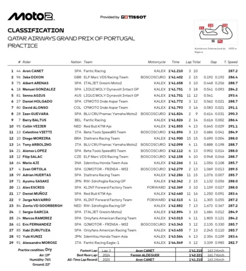 Aron Canet polverizza il record Moto2 a Portimao, Gonzalez e Moreira sono in Q2. E gli italiani? Cronaca e classifica. Riscritto per due volte il record assoluto in due turni. Aron Canet inizia al meglio il Gran Premio del Portogallo, nessun problema per l'accesso diretto alla Q2. Alcune gocce di pioggia rallentano i lavori, ma non ci sono difficoltà nemmeno per Manuel Gonzalez e Diogo Moreira, piuttosto quieti in questa prima giornata sul tracciato portoghese, ma anche Vietti ed Arbolino sono direttamente al secondo turno di qualifiche. Nel corso delle FP1 non è mancato anche l'