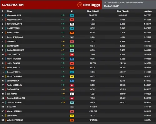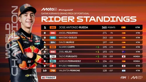 Moto3 come sempre regala grande spettacolo. A lungo infatti è letteralmente impossibile prevedere chi potrebbe vincere, finché non ci pensa Maximo Quiles. La nuova perla di Aspar Team, già Rookie dell'Anno, riesce a prendere il largo negli ultimi giri e coglie così con margine il successo nel GP a Portimao. Dietro di lui ecco Angel Piqueras e Taiyo Furusato,