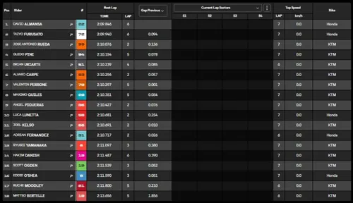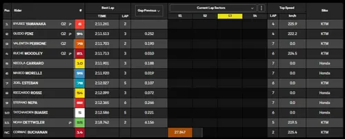 Tra i protagonisti di questa prima sessione troviamo anche Guido Pini, Nicola Carraro, Stefano Nepa e Riccardo Rossi. A referto una caduta per Buchanan, mentre Yamanaka passa al comando, con poco dopo anche un rischio scivolata ma senza conseguenze. Dei nostri andrà avanti solo Pini (nonostante un piccolo problema alla frizione), in top 4 anche per i "colleghi esordienti" Valentin Perrone, unico pilota Tech3 rimasto, e Ruché Moodley.