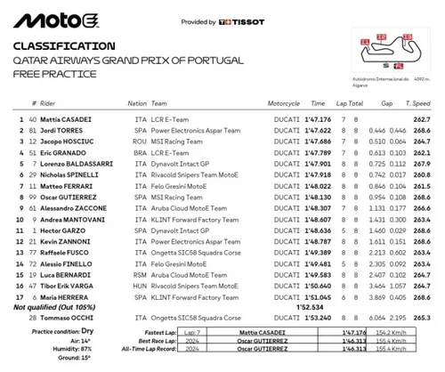 Come detto, ultimo atto della classe elettrica, con Mattia Casadei ad aprire le danze. È lui il migliore della sessione inaugurale a Portimao, seguito da Jordi Torres e dal rookie Jacopo Hosciuc. Prima occasione per prendere contatto col tracciato per quella che è la sessione più importante del venerdì.