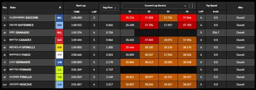 MotoE ha girato in queste condizioni oggi! Due posti per passare il turno, dopo qualche minuto la lotta si fa serrata. Alla fine emerge proprio il capoclassifica Zaccone, autore del miglior tempo, seguito da Gutierrez, ma non mancano davvero tante sorprese tra chi rimane fuori. Come Torres, che si stava migliorando ma scivola proprio alla bandiera a scacchi, oppure il campione in carica Garzo, od anche Mantovani e Baldassarri, in lizza per l'ultimo iride MotoE...