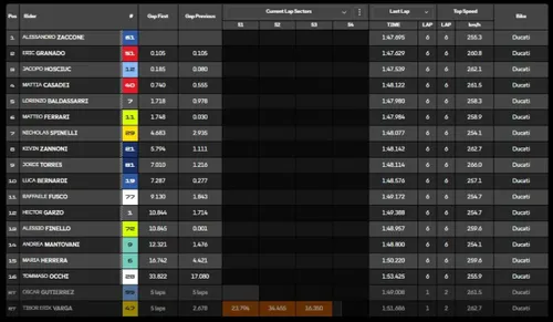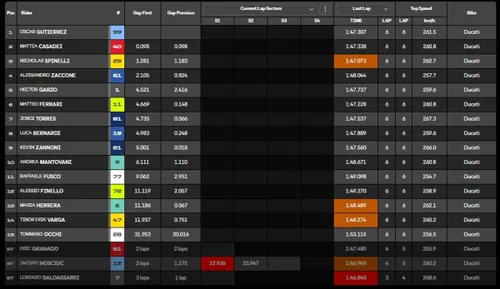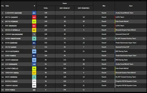 Lo scatto migliore stavolta è quello di Gutierrez, ma Zaccone alla prima curva trova lo spunto giusto per portarsi al comando. Si inserisce Casadei in seconda posizione, incombe anche Granado... Il duo LCR e Zaccone sono gli unici in lizza per l'ultimo iride MotoE, è battaglia serratissima! Anche più indietro, con un incidente ed il KO di Baldassarri... Ma c'è un ulteriore pasticcio: un contatto tra Ferrari e Granado che mette KO il brasiliano (e addio alle speranze di gloria), rischia grosso anche Zaccone! Caduta di Hosciuc dopo il bel podio di Gara 1, mentre Ferrari riceve un Long Lap per l'incidente citato. Davanti intanto rimane una lotta a due, ma si impone Oscar Gutierrez su Mattia Casadei per soli 98 millesimi. Nicholas Spinelli completa il podio, ma ecco Alessandro Zaccone 4° e nuovo campione del mondo MotoE!