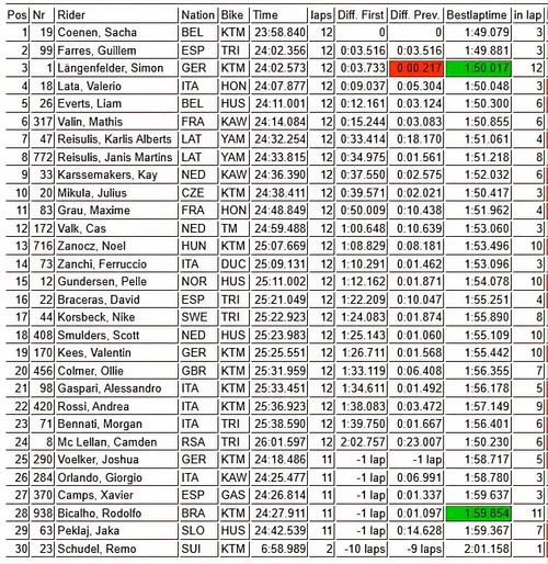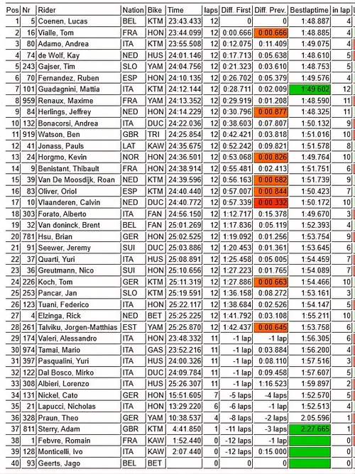 Lucas Coenen, seguito a distanza dai tre agguerriti esordienti Tom Vialle, Andrea Adamo e Kay De Wolf, senza farsi mancare colpi di scena per i big della categoria. In MX2 invece rimane sempre un solo re: