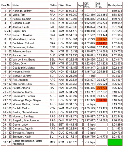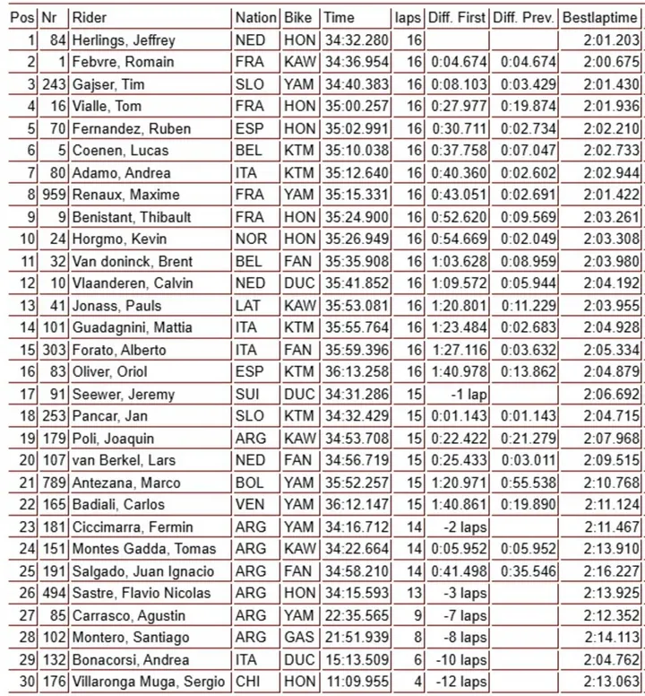 Super scatto stavolta delle Kawasaki, Febvre in particolare che prende subito il comando. Seguono Fernandez, Adamo e Vialle, mentre Herlings è 13°. Subito ritirato Guadagnini, Ducati perde Vlaanderen, occhi ora su Bonacorsi che mira alla top 10. Ma al 2° giro ecco la bandiera rossa, tutto fermo e si vede bene anche cos'è successo al via: la partenza anticipata di Forato per il cancelletto giù anzitempo, mentre altri due piloti sono invece bloccati dai cancelletti rimasti su nonostante il via. Pochi minuti e ripartenza per tutti dalla classifica originaria: inizio sempre concitato, finché non la spunta Vialle su Renaux, Febvre, Gajser, Fernandez, Herlings, Adamo e via via tutti gli altri. Non manca un "mucchio" iniziale, tra i piloti coinvolti anche Forato... Col passare dei giri però il campione risale e passa al comando, Renaux invece incappa in una caduta, mentre Gajser vede da molto vicino il primo podio con Yamaha e infine lo strappa di forza a Vialle. Finisce così? Assolutamente no, attenzione allo scatenato Jeffrey Herlings che ha deciso che il 2° posto non gli basta: rimonta a passo di marcia su Febvre, lo passa e coglie il secondo trionfo di giornata, che vale così il trionfo di GP. Non poteva esserci esordio migliore con Honda!