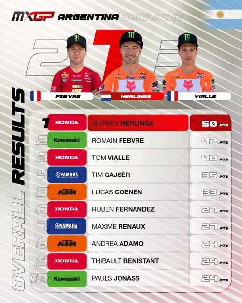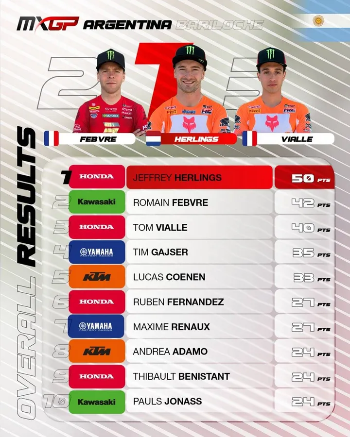 Honda trionfa in Argentina con le sue nuove stelle: Herlings vince il GP, il campione Febvre 2°, Vialle completa il podio ma è 2° nella generale. Cronaca e classifiche.
