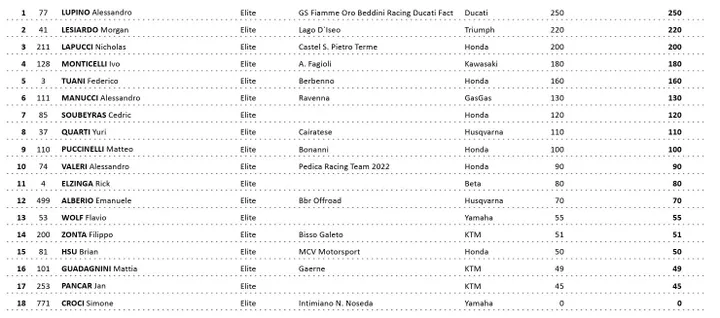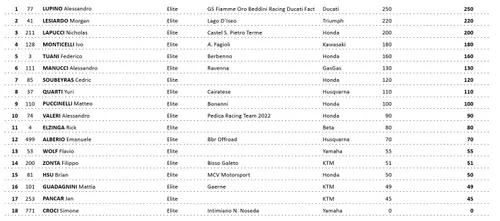 Successo della Ducati Desmo450 MX con Alessandro Lupino, come lui stesso ha raccontato "In condizioni fisiche non perfette, con una brutta influenza", oltre al fatto che "Sono salito in moto solo a gennaio e sono stato molto preso dai test e dagli impegni con la Federazione Italiana, senza riuscire a prepararmi come avrei voluto". È stata un'occasione anche per provare nuove soluzioni sulla moto factory, "Che potrebbero rivelarsi utili anche ai ragazzi della MXGP". Per Lupino parliamo di numeri da campione a livello italiano: 50° podio e 35° successo, indiscusso riferimento della serie tricolore. Per Ducati un ottimo spunto dopo la partenza mondiale non proprio ottimale.