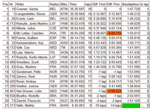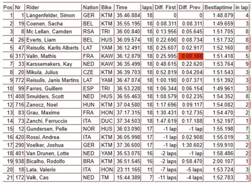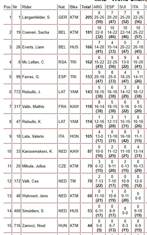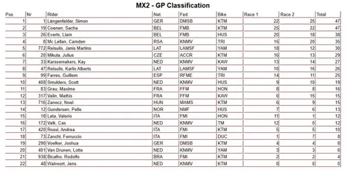 La replica di quanto detto in precedenza: Lucas Coenen è davvero indomabile in Sardegna, ancora holeshot e fuga per la vittoria anche in questa seconda manche. Solo al via però, visto che in seguito la situazione cambia: Coenen sbaglia, cade e alla ripartenza ha perso parecchie posizioni, mentre passano avanti in particolare Laengenfelder, Farres e Mikula, più Zanchi in agguato a ridosso della zona podio. Purtroppo per poco, giro dopo giro l'alfiere Ducati perderà svariate posizioni... Davanti sarà una storia a senso unico: Simon Laengenfelder si assicura la vittoria ed il terzo trionfo di GP in questo 2026, con Sacha Coenen in seconda posizione, ma occhio anche a Liam Everts, terzo di GP e terzo anche nella generale. Ahimè, non ci sono gioie per i ragazzi italiani...