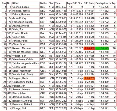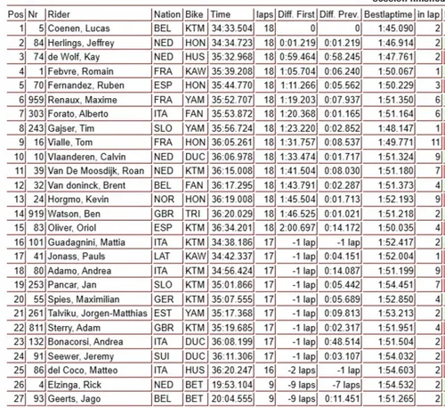 poleman Jeffrey Herlings, mentre Coenen risale dal 6° posto, giro dopo giro con un passo veramente da urlo. Addirittura ad un certo punto della corsa è ben 6 secondi più rapido di Herlings! A passo di marcia quindi risale, si porta nelle posizioni importanti e infine prende il comando, volando via a cogliendo il successo con quasi 20 secondi di margine sul pilota Honda e 46 sul campione in carica Romain Febvre! Guardando in casa Italia, l'esordiente Andrea Adamo porta a casa un buon 6° posto, è 8° Alberto Forato, mentre per Ducati abbiamo Calvin Vlaanderen 15°.