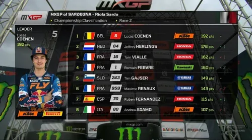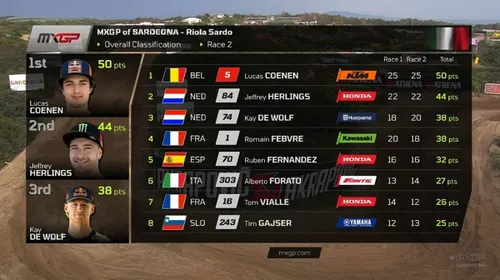 Trionfo in Gara 1, la replica in Gara 2. Lucas Coenen voleva mantenere il primato MXGP e c'è riuscito nel migliore dei modi, col dominio incontrastato nella domenica del GP di Sardegna. Questo nonostante una caduta in Gara 2 che non cambia minimamente il risultato, visto che l'alfiere KTM aveva un ampio margine su Herlings, De Wolf (al primo podio in classe regina), Febvre e tutti gli altri inseguitori. Alberto Forato miglior italiano del GP Sardegna col 6° posto overall. Ecco com'è andata e le classifiche finali.