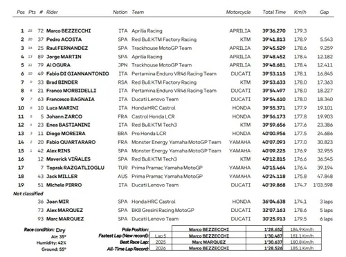 In pochi giri ecco la risposta: Marquez si accende, riprende Martin e Acosta, e scatta la battaglia per il 3° posto. Almeno finché Acosta si forza non riesce a tenersi alle spalle sia Marquez che Martin, prendendosi così l'ultimo gradino del podio. Le posizioni si congelano, sembra finita... Fino ai giri conclusivi, con un colpo di scena: Marc Marquez finisce fuori pista, rientra, ma deve fermarsi: ha una gomma a terra! Poco dopo cade Alex Marquez, Joan Mir si ferma. Mentre Marco Bezzecchi vola indisturbato verso il trionfo, dopo il disastro di ieri il pronto riscatto, con doppia gioia Aprilia.