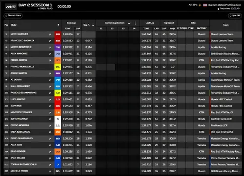 Marc Marquez in testa, poi Bagnaia, Bezzecchi, Alex Marquez: la testa della classifica si presenta così alla fine della prima sessione odierna al Buriram, e con il record assoluto ormai ad un passo (1:28.700 di Bagnaia. Mattinata di time attack, con attualmente 34° C che salgono a 51° sull'asfalto e umidità al 43%, prima delle simulazioni di gara lunga in programma per il pomeriggio. Dev'essere una seconda ed ultima giornata di test di conferme, in particolare sul piano tecnico, per poter omologare soprattutto l'aerodinamica, oltre a sistemarsi per la prima gara e per il Mondiale MotoGP 2026 in generale. A referto però anche qualche problema tecnico nei primi 45 minuti per Di Giannantonio e Razgatlioglu, poi ripartiti. Si ricomincia alle 7:25 ora italiana con bandiera a scacchi alle 11.30 (13:25-17:30 in Thailandia).