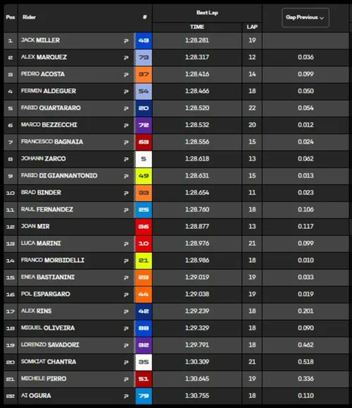 Pol Espargaro (per Vinales) e Lorenzo Savadori (per Martin). Un dettaglio di questo turno inaugurale è il gesticolare di Bagnaia al box, assieme a qualche "manovra al limite" in pista, ad indicare chiaramente qualche problema alla sua Desmosedici. Una notizia positiva è vederlo poi scalare la classifica e portarsi in 7^ posizione, anche se non troppo soddisfatto. Le Ducati che volano in questo turno sono invece quelle del duo Gresini, in particolare di Alex Marquez a lungo al comando, finché non arriva il beniamino di casa.
