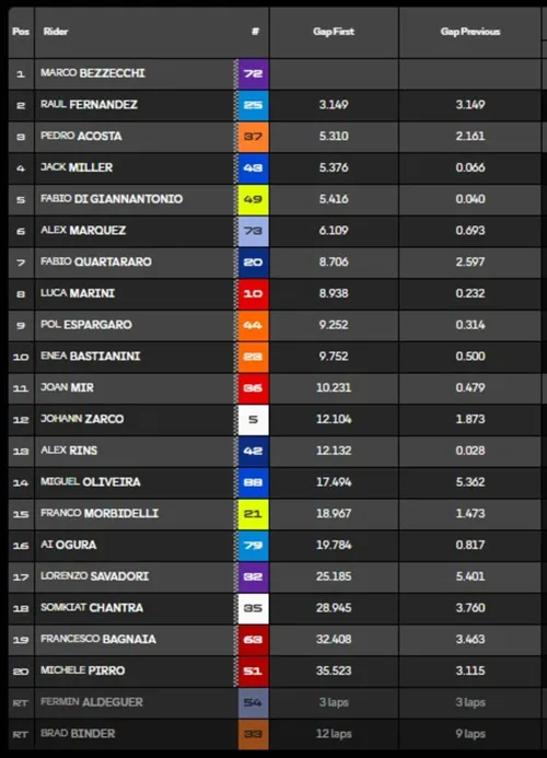 In breve si profila un'altra gara disastrosa per Bagnaia, sempre più giù fino a trovarsi in penultima posizione, davanti solamente a Pirro... Conscio della gara complessa di domani per il doppio Long Lap, Bezzecchi punta al massimo almeno oggi e nella seconda parte di gara ha la meglio su Fernandez, prendendo presto il largo. Un 1-2 Aprilia nella MotoGP Sprint di Phillip Island è già una grande soddisfazione per il marchio di Noale! A seguire è battaglia per il terzo gradino del podio, lo vuole in particolare il beniamino di casa Miller... Ma per 66 millesimi la beffa, il 3° posto alla fine andrà a Pedro Acosta.