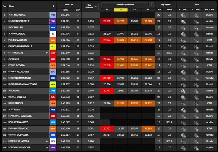 Senza dimenticare però l'altra parte del box: Bagnaia cerca il riscatto dopo la sfortuna, serve partire bene su una pista sulla quale nel 2023 ha trionfato sia nella Sprint che nel GP, senza dimenticare il 2° posto nel 2021. Serve qualcosa di concreto anche in casa Aprilia, marchio reduce da un GP Malesia decisamente non brillante... C'è sempre Lorenzo Savadori in azione, mentre Jorge Martin continua il processo di recupero. A proposito di Aprilia, a referto la caduta di Raul Fernandez, un violento incidente in curva 1 che lascia il pilota Trackhouse un po' intontito, ma comunque in piedi. In seguito però andrà al Centro Medico per controlli, seguirà il trasferimento in ospedale per una TAC.
