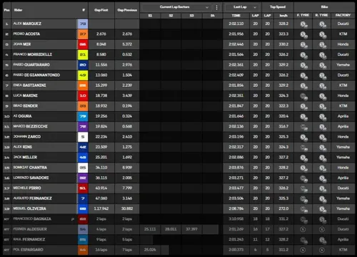 Alex Marquez vuole la vittoria, dopo un paio di giri sferra l'attacco a Bagnaia e si porta al comando. Un giro dopo ci prova anche Acosta, ma l'italiano non ci sta e scatta il botta e risposta. Più indietro cade Pol Espargaro, un vero peccato visto il solido weekend...
