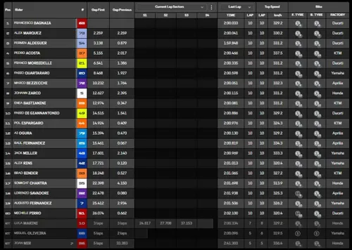 Addio sogni di podio, distante appena mezzo secondo... A referto la caduta di Oliveira poco dopo, mentre negli ultimi giri il terzo posto di Acosta è in serio pericolo per la risalita di Aldeguer. Passa il rookie MotoGP, un errore dell'alfiere KTM gli permette anche di prendere margine, mentre più indietro Marini ed Espargaro sono a contatto, a terra il pilota italiano e doppia delusione Honda.