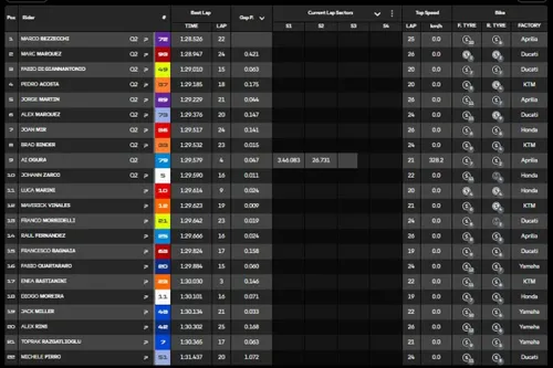"riccio" visto nei test invece è comparso solo sul codone delle Aprilia Trackhouse. Sessione che sembra procedere in tranquillità, ma il cielo si fa sempre più nero... A mezz'ora dalla fine scatta l'assalto alla top 10, bisogna fare presto per non rimanere fuori. Come per Marc Marquez e Pecco Bagnaia, a lungo fuori dalla zona sicura prima della risalita. Meglio detto, risale solo il #93, l'italiano invece è incredibilmente lontanissimo... Di Giannantonio invece, stavolta da solo, continua a martellare e consolida la prima posizione in classifica, seguito da vicino dal duo Aprilia factory e dalla KTM di Acosta, prima di trovare i fratelli Marquez. Ma non finisce qui, Bezzecchi non ci sta e polverizza il record MotoGP, è lui l'uomo da battere! Marc Marquez chiude 2°, terzo Di Giannantonio sulla prima KTM di Acosta. A referto una caduta finale per Ai Ogura, ma il pilota Trackhouse Aprilia conserva la Q2.